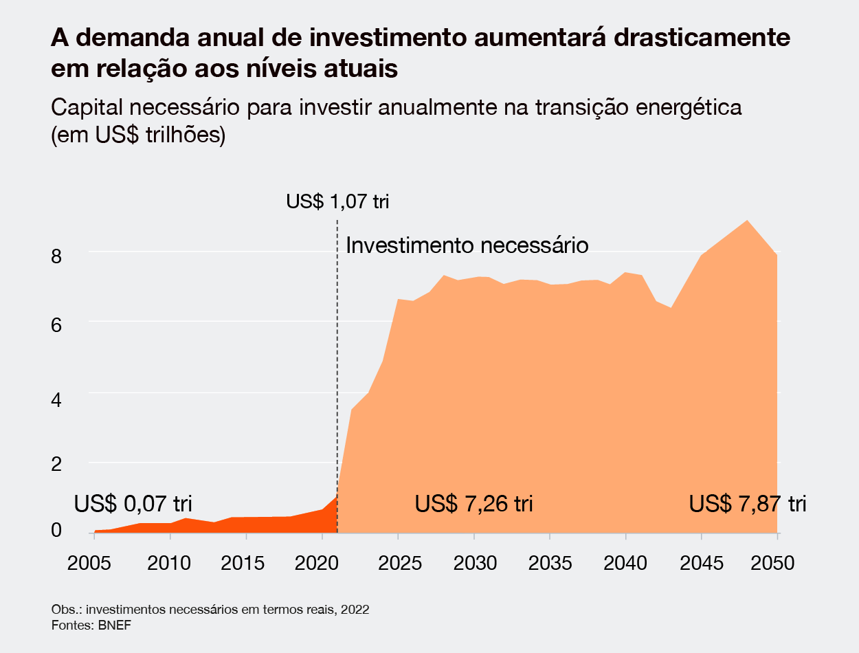 Para evitar que essas perdas se multipliquem nas próximas décadas, será necessário um volume inédito de investimentos na transição energética. De acordo com estimativas da Agência Internacional de Energia (IEA) e do Painel Intergovernamental sobre Mudanças Climáticas (IPCC), esses investimentos devem ultrapassar US$ 4 trilhões por ano já em 2025, podendo chegar a um patamar entre US$ 7,2 trilhões e US$ 8,9 trilhões anuais entre 2030 e 2050 (ver gráfico abaixo).